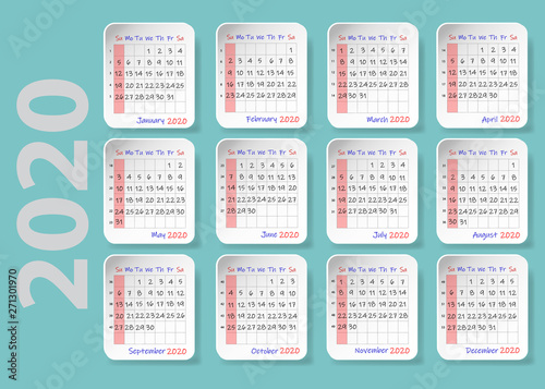 Calendar For 2020 Twelve Sheets With The Shadows Are Containing A Calendar For Each Month Of The Year With Days Of The Month Week Starts Sunday Buy This Stock Vector And