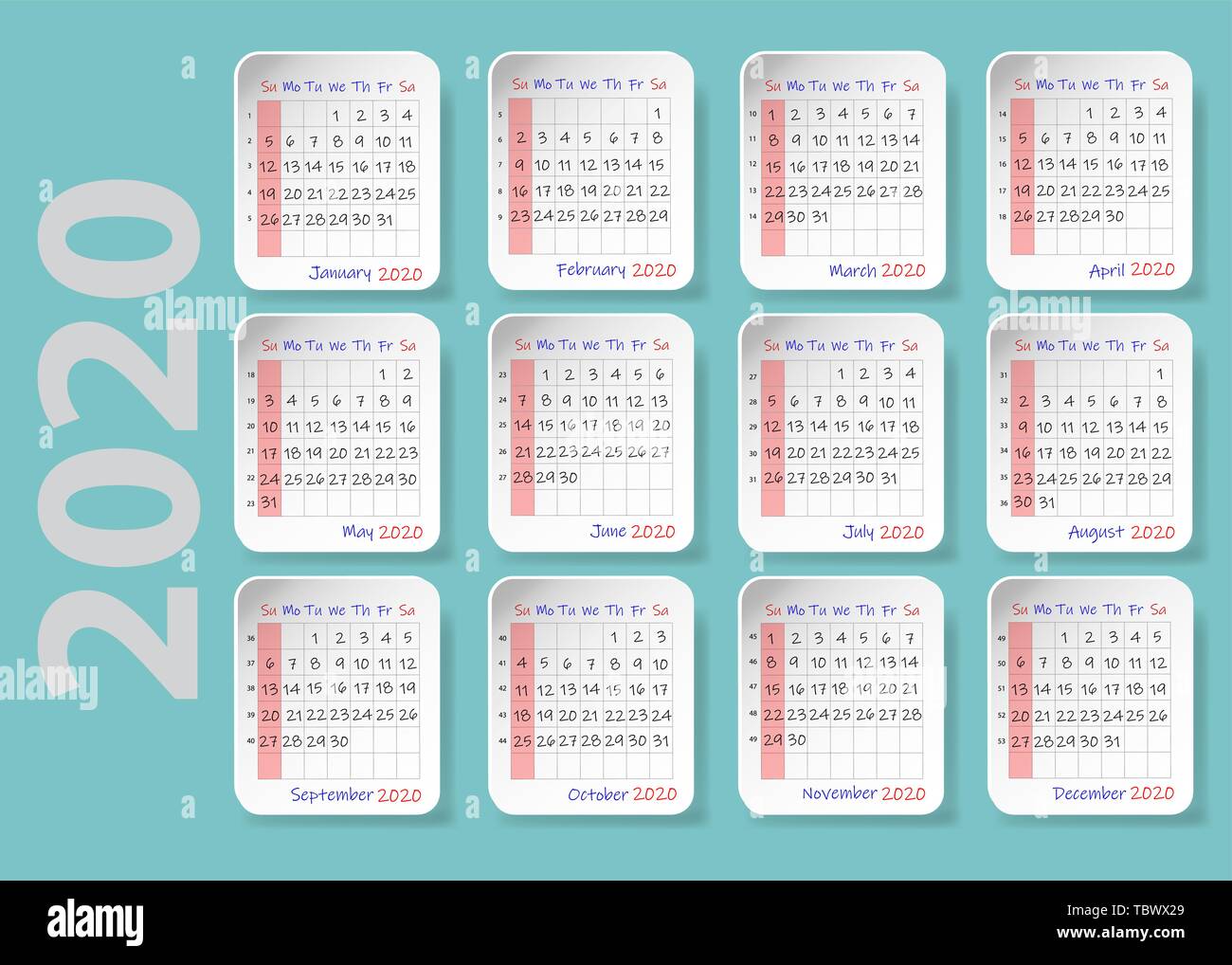 Calendar For 2020 Twelve Sheets With The Shadows Are Containing A Calendar For Each Month Of The Year With Days Of The Month Week Starts Sunday Stock Vector Image Art Alamy
