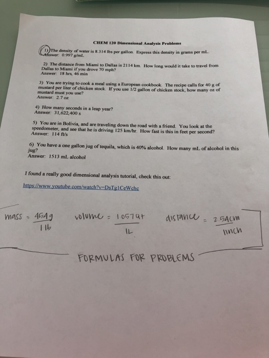 Solved Chem 120 Dimensional Analysis Problems 1 The Dens