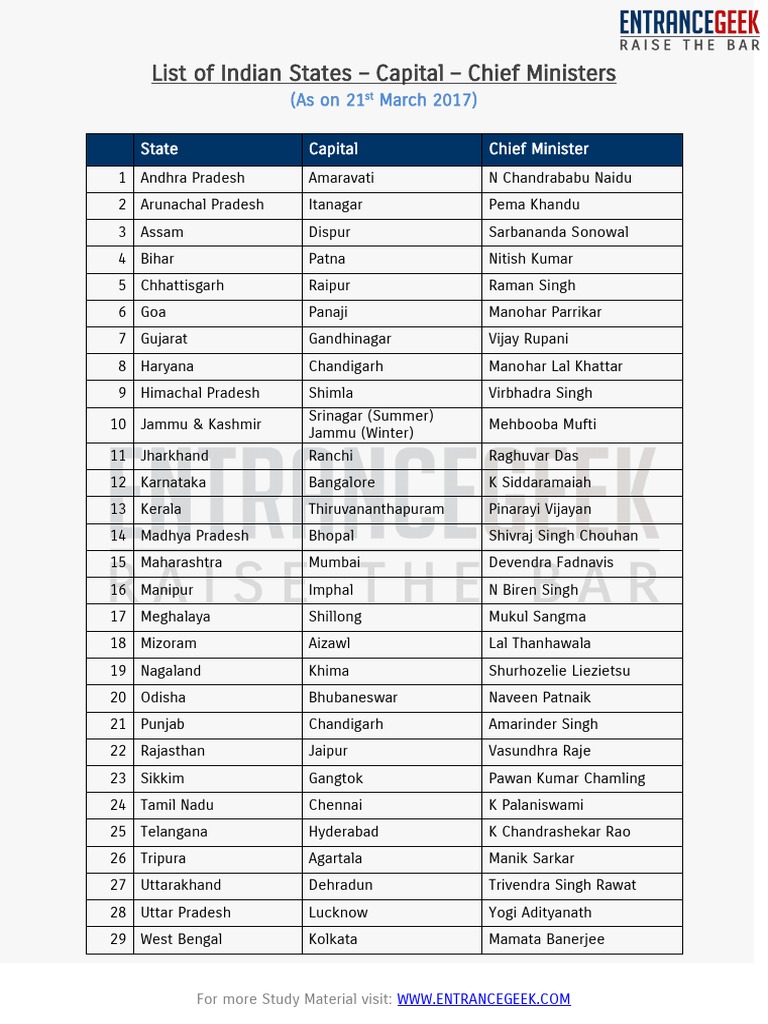 List Of All Indian States And Their Capitals And The Union