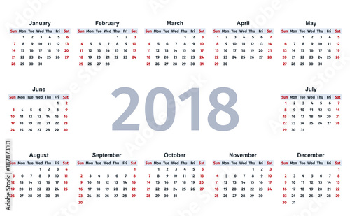 2018 Calendar Year Vector Graphics Week Starts Sunday